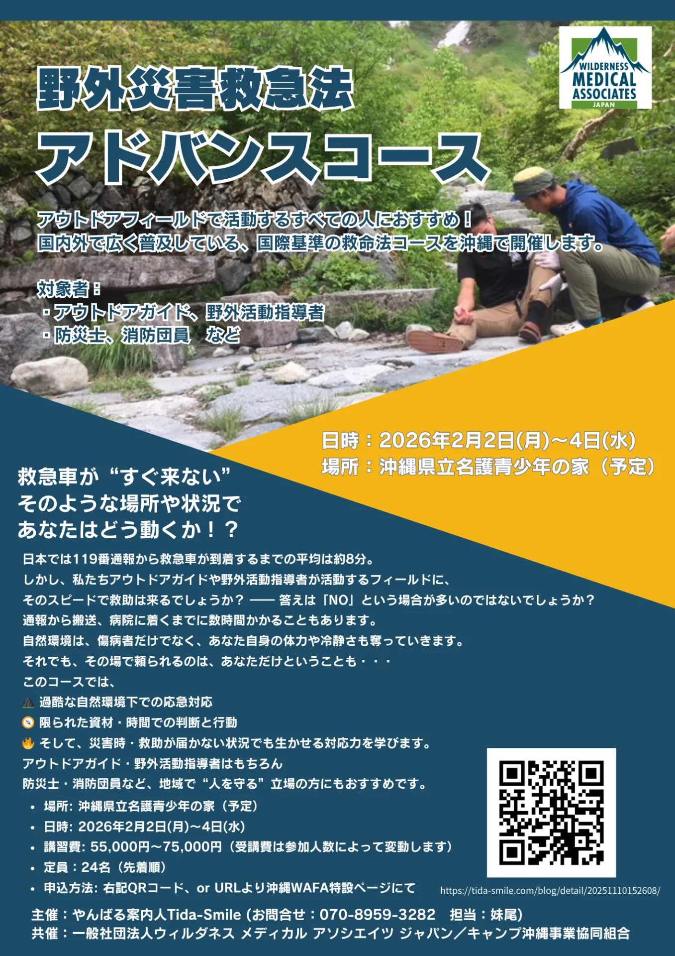 アウトドアガイドにとって必須ともいえる、国内外で広く普及している野外災害救急法・アドバンスコースを沖縄で開催します。